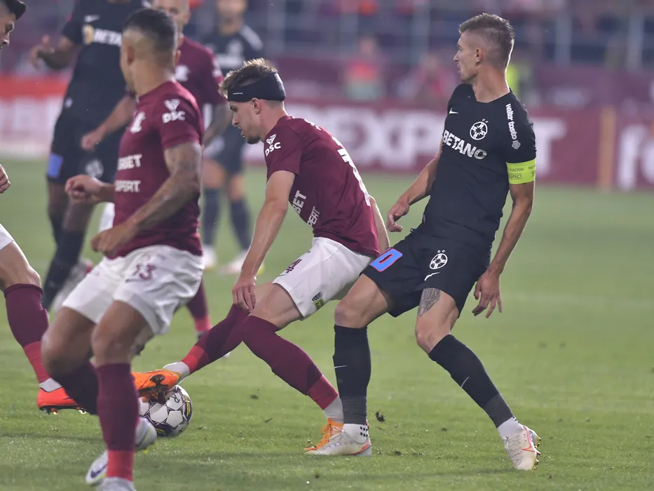 Mattias Kait si Florin Lucian Tanase in meciul de fotbal dintre Rapid Bucuresti si FCSB, contand pentru Superliga Superbet, desfasurat pe Stadionul Rapid Giulesti din Bucuresti, duminica 24 iulie 2022. © FOTO:Razvan Pasarica/SPORT PICTURES