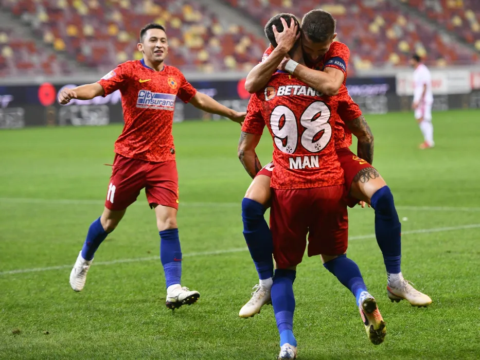 Olimpiu Vasile Morutan si Florin Lucian Tanase se bucura dupa un gol reusit in meciul de fotbal dintre FCSB si Dinamo Bucuresti, contand pentru Liga 1 Casa Pariurilor, desfasurat fara spectatori pe Arena Nationala din Bucuresti, sambata 3 octombrie 2020. © FOTO:Razvan Pasarica/SPORT PICTURES
