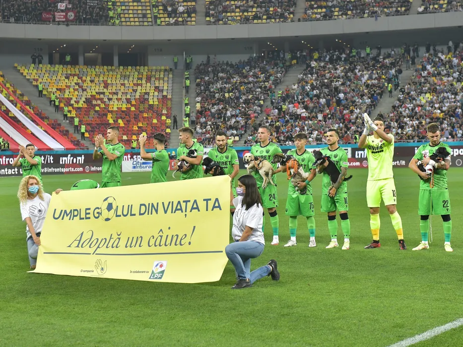 Fotbalistii dinamovisti ies pe teren cu caini in brate la meciul de fotbal dintre FCSB si Dinamo Bucuresti, contand pentru Liga 1 Casa Pariurilor, desfasurat pe Arena Nationala din Bucuresti, duminica 12 septembrie 2021. © FOTO:Razvan Pasarica/SPORT PICTURES