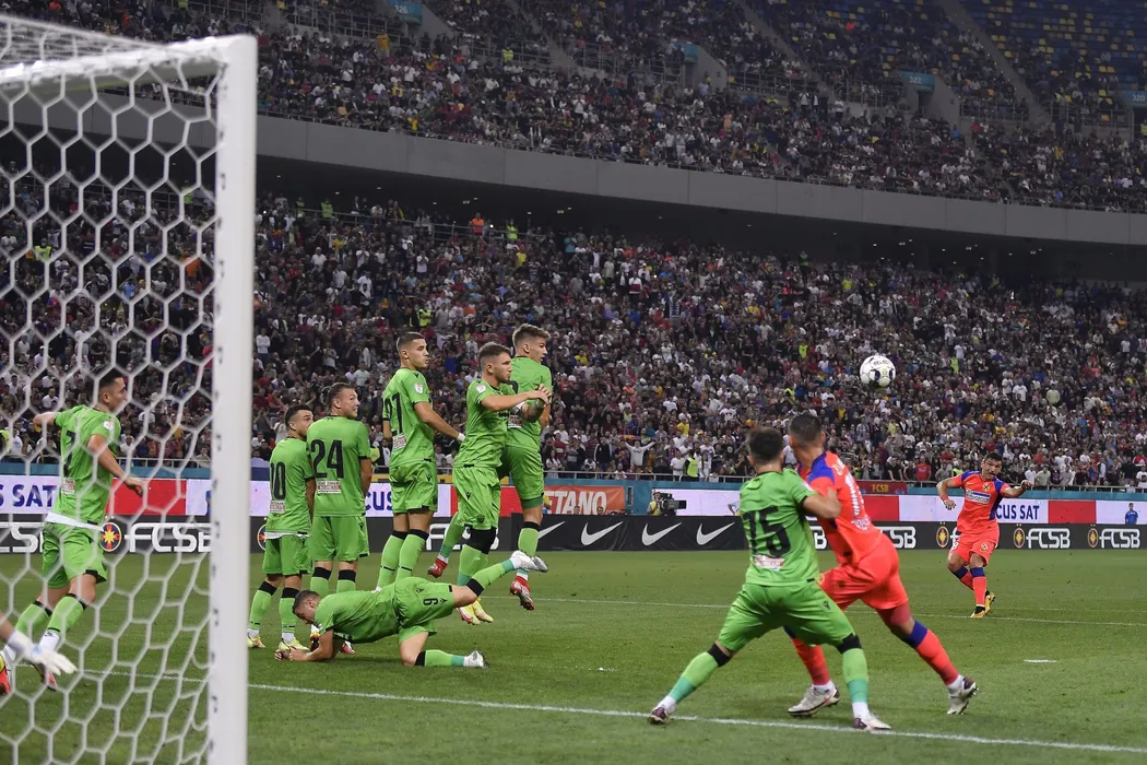 Claudiu Keseru (D), de la FCSB, suteaza in timpul meciului de fotbal contra echipei Dinamo din etapa a VIII-a a Ligii 1, disputat pe Arena Nationala din Bucuresti, duminica, 12 septembrie 2021. ALEX NICODIM / MEDIAFAX FOTO