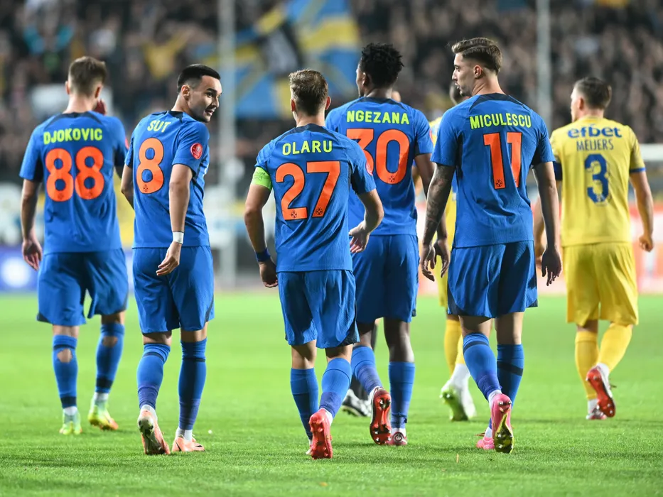 Bucurie a fotbalistilor stelisti dupa un gol marcat cu Adrian Gheorghe Sut si David Raul Miculescu in meciul de fotbal dintre Petrolul Ploiesti si FCSB, din cadrul Superligii Superbet, desfasurat pe Stadionul Ilie Oana din Ploiesti, sambata 28 octombrie 2023. © FOTO:Razvan Pasarica/SPORT PICTURES