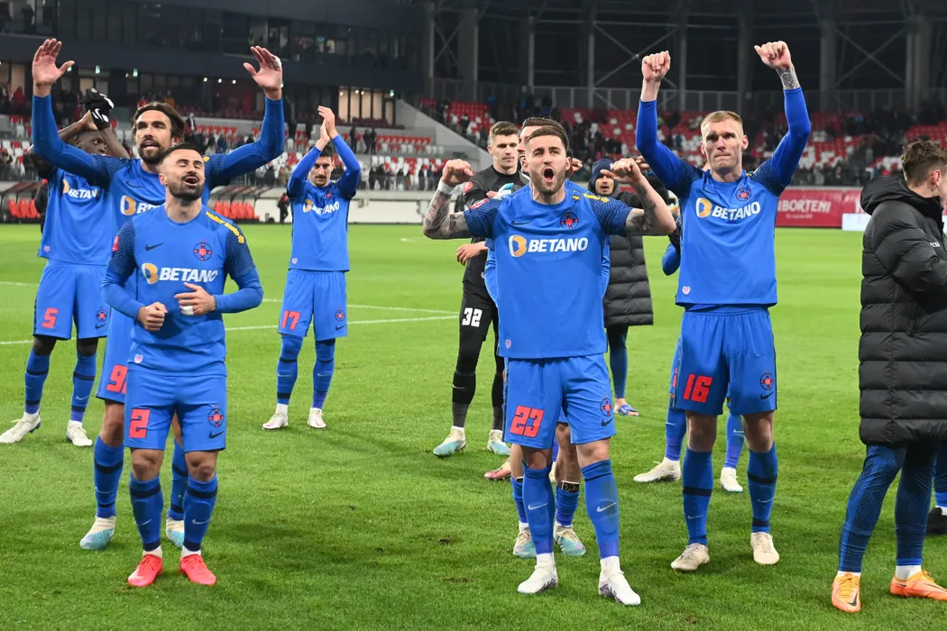 Fotbalistii stelisti Andrea Compagno,Valentin Cretu,Ovidiu Marian Popescu si Joonas Tamm saluta galeria dupa meciul de fotbal dintre Sepsi OSK Sfantu Gheorghe si FCSB, contand pentru Play-off-ul Superligii Superbet, desfasurat pe Sepsi Arena din Sfantu Gheorghe, luni 3 aprilie 2023. © FOTO:Razvan Pasarica/SPORT PICTURES