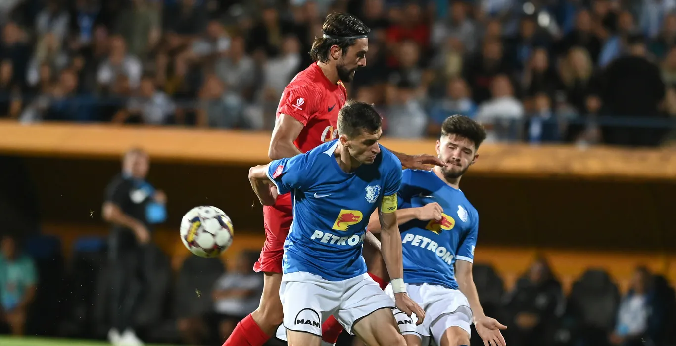 Andrea Compagno, Ionut Justinian Larie si Dan Sirbu in meciul de fotbal dintre Farul Constanta si FCSB, contand pentru Superliga Superbet, desfasurat pe Stadionul central al Academiei Gheorghe Hagi din Ovidiu, miercuri 31 august 2022. © FOTO:Razvan Pasarica/SPORT PICTURES