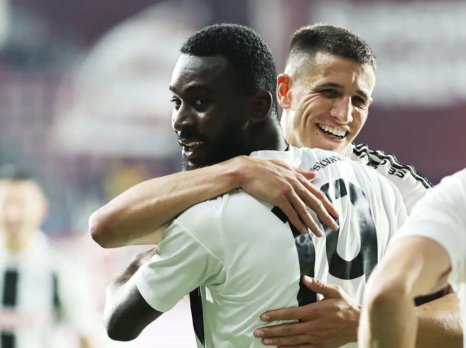Issouf Macalou felicitat de Lucas Gabriel Masoero dupa un gol marcat in meciul de fotbal dintre FC Rapid 1923 Bucuresti si FC Universitatea Cluj, din cadrul Superligii Superbet - Play-Off, desfasurat pe Superbet Arena-Giulesti din Bucuresti, sambata 19 aprilie 2025. © FOTO: Gheorghe Fluster/SPORT PICTURES