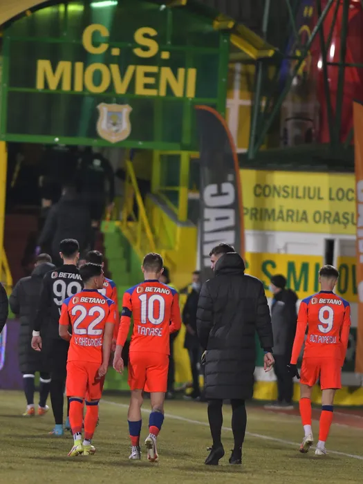 Fotbalistii stelisti parasesc tristi terenul dupa meciul de fotbal dintre CS Mioveni si FCSB, contand pentru Liga 1 Casa Pariurilor, desfasurat pe Stadionul Orasenesc din Mioveni, sambata 19 februarie 2022. © FOTO:Razvan Pasarica/SPORT PICTURES
