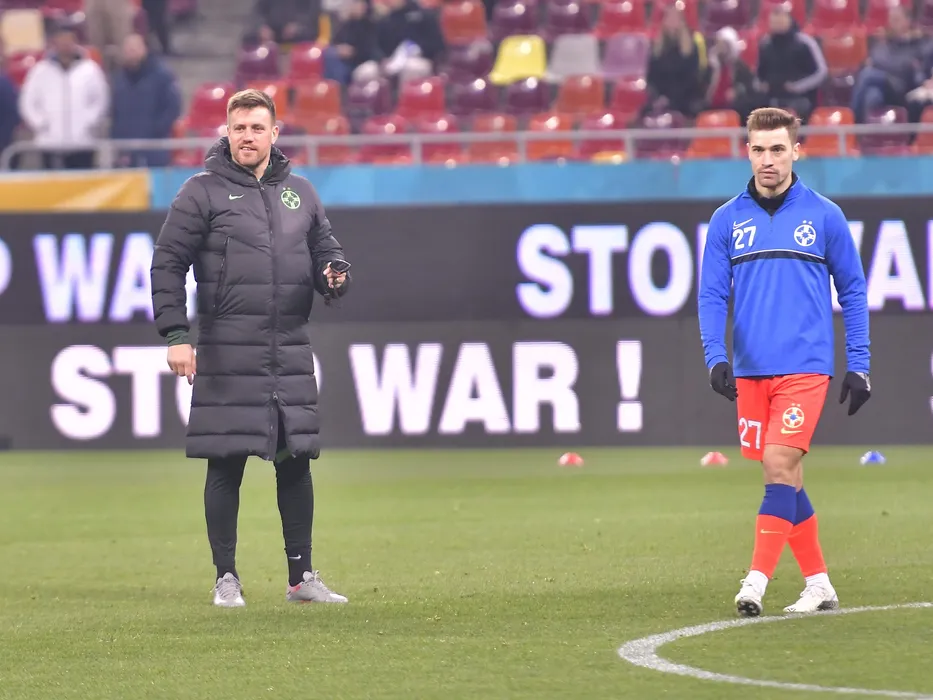 Mihai Pintilii la incalzire alaturi de Darius Dumitru Olaru in meciul de fotbal dintre FCSB si Farul Constanta, contand pentru Play-off-ul Ligii 1 Casa Pariurilor, desfasurat pe Arena Nationala din Bucuresti, luni 14 martie 2022. © FOTO:Razvan Pasarica/SPORT PICTURES