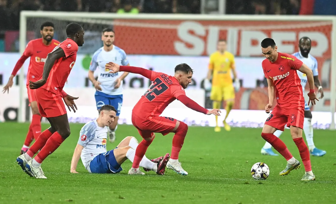 Joyskim Aurelien Dawa Tchakonte, Louis Munteanu, Deian Cristian Sorescu si Adrian Gheorghe Sut in meciul de fotbal dintre FCSB si Farul Constanta, contand pentru Play-off-ul Superligii Superbet, desfasurat pe Arena Nationala din Bucuresti, luni 17 aprilie 2023. © FOTO:Razvan Pasarica/SPORT PICTURES