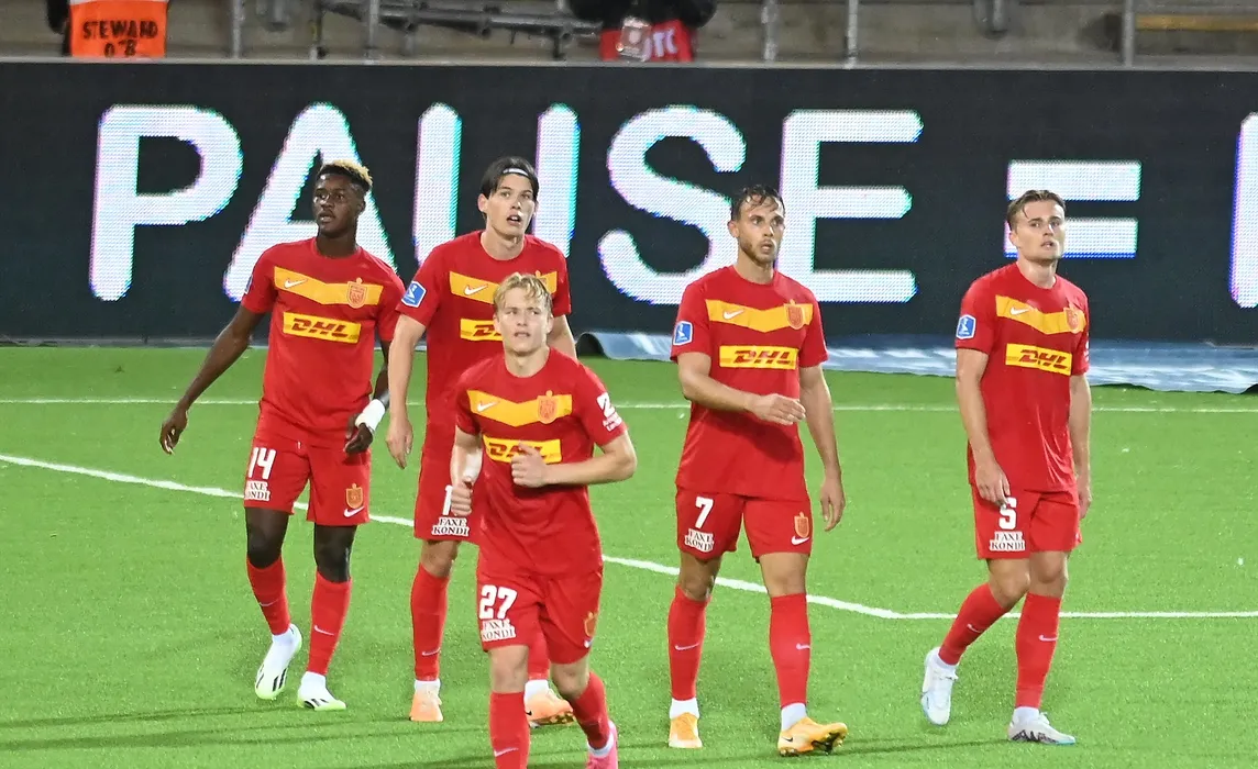 Fotbalistii danezi se bucura dupa un gol marcat de catre Marcus Ingvartsen la meciul de fotbal dintre FC Nordsjælland si FCSB, din cadrul UEFA Europa Conference League, desfasurat pe Stadionul Right to Dream Park din Farum, joi 17 august 2023. © FOTO:Razvan Pasarica/SPORT PICTURES