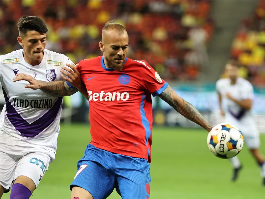 Denis Alibec si Mario Cristian Tudose in meciul dintre FCSB si FC Arges, contand pentru Superliga Superbet, desfasurat pe Arena Nationala din Bucuresti, duminica 24 august 2025. © FOTO:Gheorghe Fluster/SPORT PICTURES