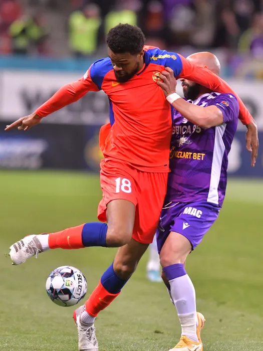 Sylas Laouari Edjouma Malcom si Iasmin Latovlevici in meciul de fotbal dintre FCSB si FC Arges, contand pentru Play-off-ul Ligii 1 Casa Pariurilor, desfasurat pe Arena Nationala din Bucuresti, luni 2 mai 2022. © FOTO:Razvan Pasarica/SPORT PICTURES