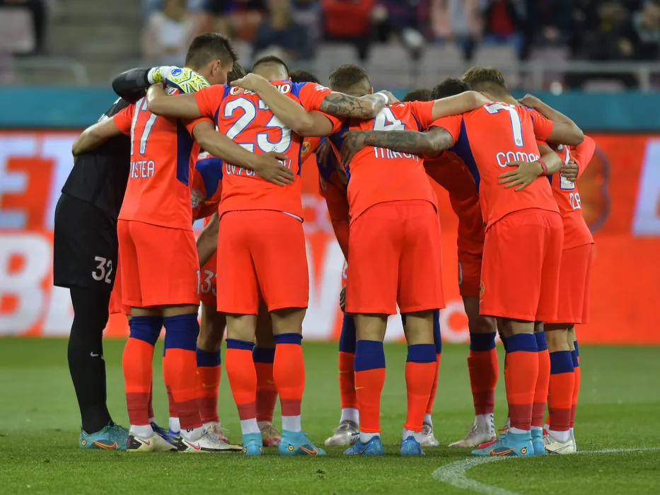 Fotbalistii stelisti se incurajeaza la startul meciului de fotbal dintre FCSB si FC Arges, contand pentru Play-off-ul Ligii 1 Casa Pariurilor, desfasurat pe Arena Nationala din Bucuresti, luni 2 mai 2022. © FOTO:Razvan Pasarica/SPORT PICTURES