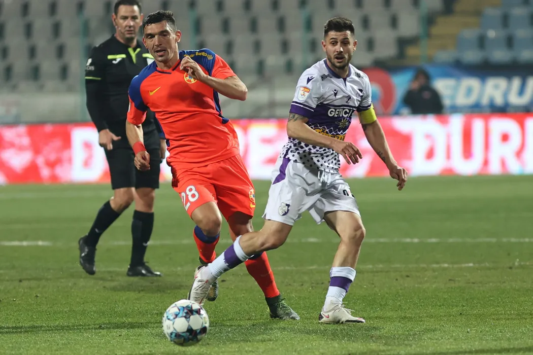 Claudiu Keseru (S), de la FCSB, lupta pentru balon cu Andrei Serban (D), de la FC Arges in meciul de fotbal din etapa a XIV-a a Ligii 1, disputat pe stadionul Municipal din Buzau, duminica, 31 octombrie 2021. GEORGE FILIP/MEDIAFAX FOTO