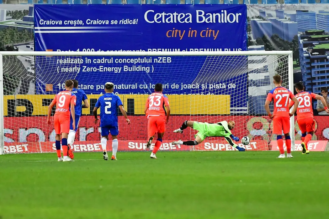Portarul Radu Mogosanu, de la FC Universitatea 1948, incearca sa apere un penalty executat de Claudiu Keseru (D), de la FCSB, in meciul de fotbal din etapa a IX-a a Ligii 1, disputat in Craiova, sambata, 18 septembrie 2021. REMUS BADEA / MEDIAFAX FOTO