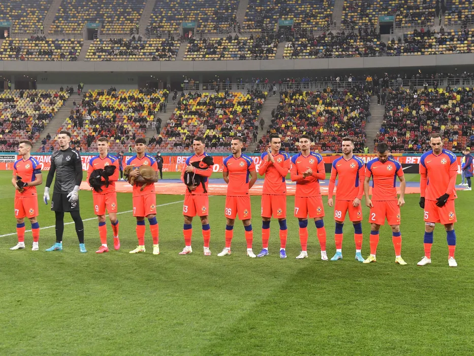 Fotbalistii stelisti la startul meciului de fotbal dintre FCSB si FC U Craiova, contand pentru Liga 1 Casa Pariurilor, desfasurat pe Arena Nationala din Bucuresti, duminica 6 februarie 2022. © FOTO:Razvan Pasarica/SPORT PICTURES