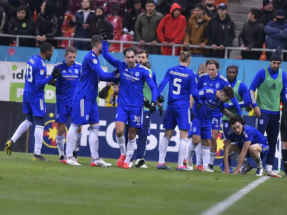 Bucurie a fotbalistilor craioveni dupa un gol marcat cu Bradley Diallo, Alexandru Vlad Achim, Andre P. Benjamin Van Durmen, William Guido R Baeten si Claudiu Cristian Balan in meciul de fotbal dintre FCSB si FC U Craiova, contand pentru Liga 1 Casa Pariurilor, desfasurat pe Arena Nationala din Bucuresti, duminica 6 februarie 2022. © FOTO:Razvan Pasarica/SPORT PICTURES