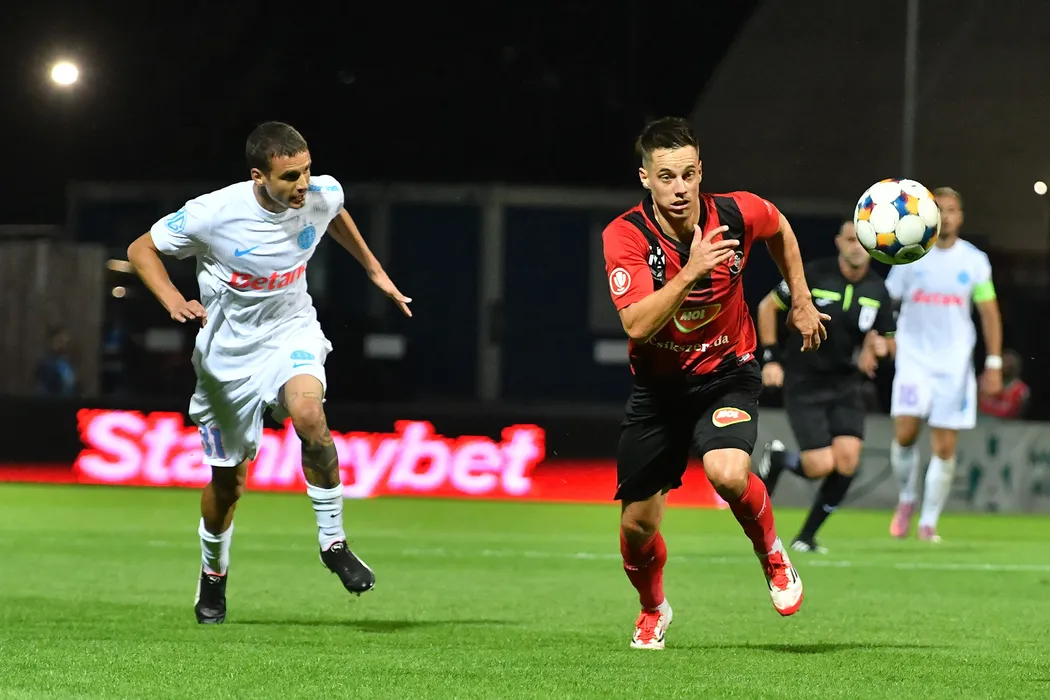 Lorand Paszka si Juri Cisotti in meciul de fotbal dintre FK Csikszereda Miercurea Ciuc si FCSB, contand pentru Superliga Superbet, desfasurat pe Stadionul Municipal din Miercurea Ciuc, duminica 14 septembrie 2025. © FOTO:Bogdan Balas/SPORT PICTURES