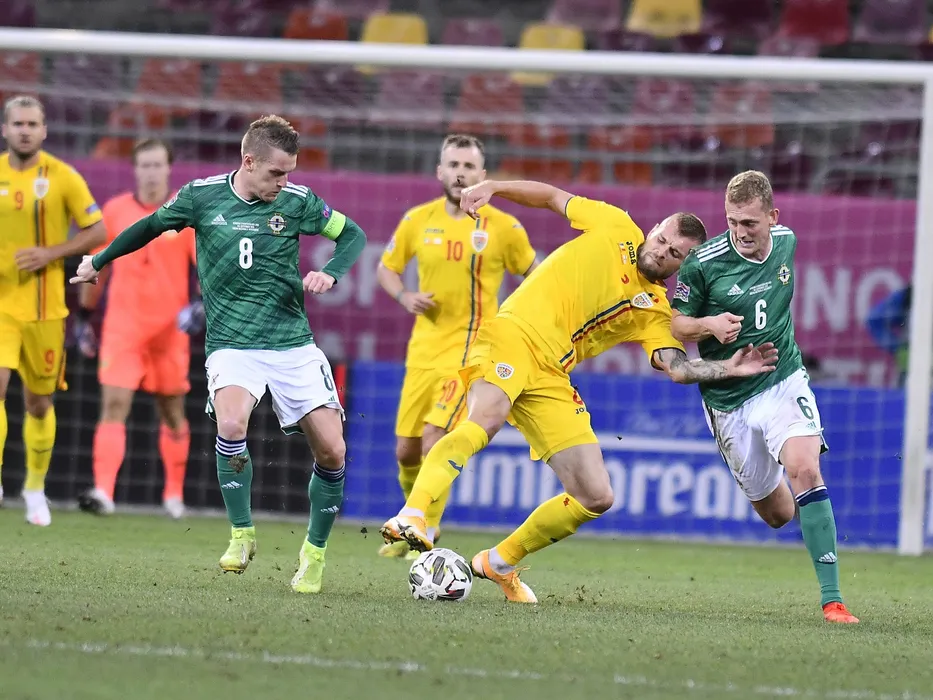 Steven Davis, Alexandru Cretu si George Saville in meciul de fotbal dintre Romania si Irlanda de Nord, contand pentru Liga Natiunilor, desfasurat fara spectatori pe Arena Nationala din Bucuresti, vineri 4 septembrie 2020. © FOTO:Razvan Pasarica/SPORT PICTURES