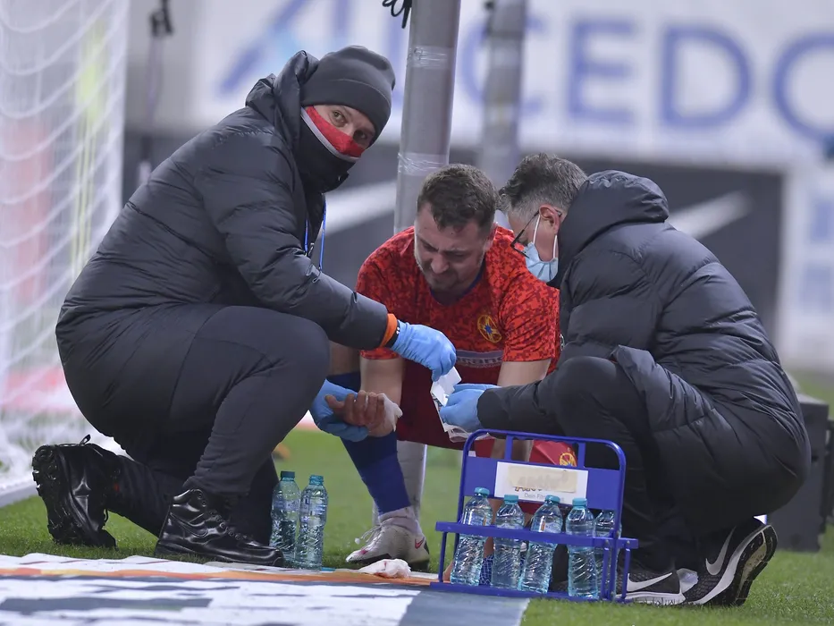 Andrei George Miron accidentat la mana alaturi de staff-ul medical stelist cu doctorul Flavian Aramitu in stanga in meciul de fotbal dintre FCSB si Gaz Metan Medias, contand pentru Liga 1 Casa Pariurilor, desfasurat fara spectatori pe Arena Nationala din Bucuresti, duminica 7 martie 2021. © FOTO:Razvan Pasarica/SPORT PICTURES