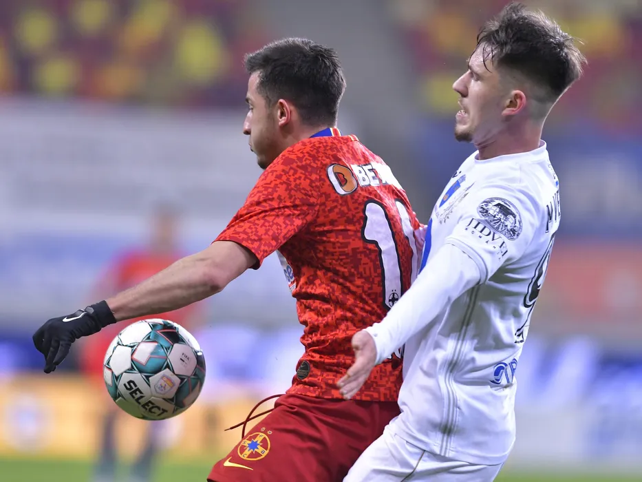 Olimpiu Vasile Morutan si Mihai Velisar in meciul de fotbal dintre FCSB si Gaz Metan Medias, contand pentru Liga 1 Casa Pariurilor, desfasurat fara spectatori pe Arena Nationala din Bucuresti, duminica 7 martie 2021. © FOTO:Razvan Pasarica/SPORT PICTURES