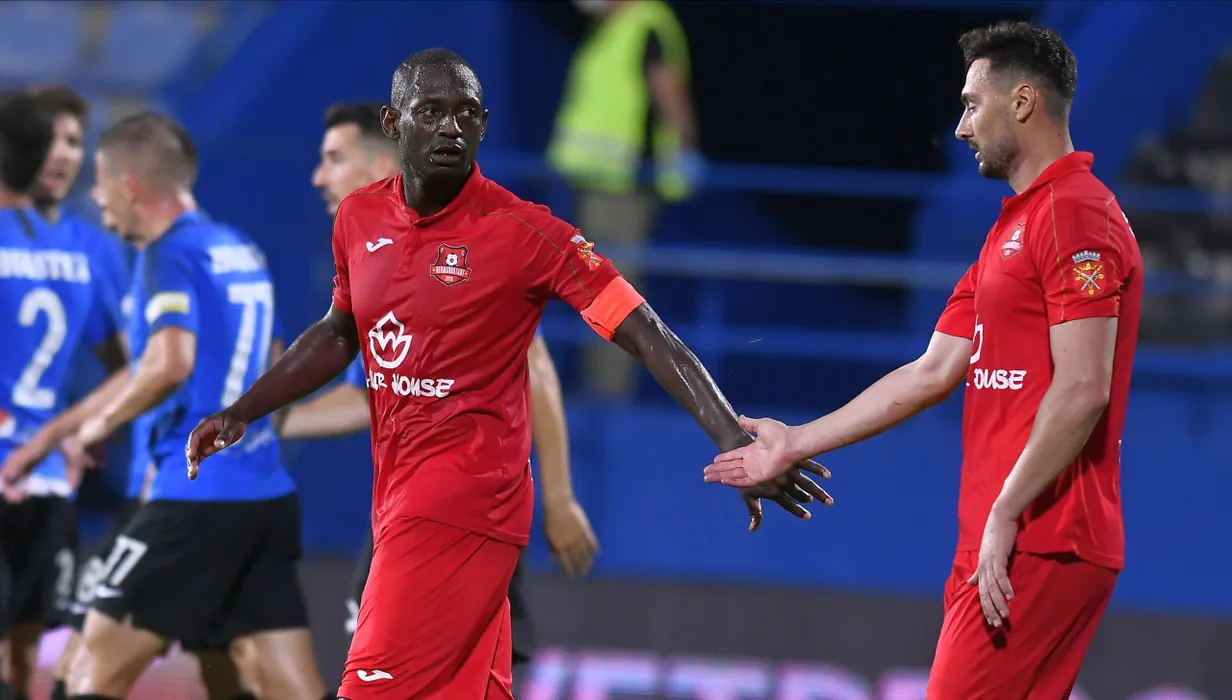Ousmane Viera Diarrassouba il incurajeaza pe Ionut Stoica dupa un nou gol primit in meciul de fotbal dintre FC Viitorul si AFC Hermannstadt, contand pentru play-out-ul Ligii 1 Casa Pariurilor, disputat fara spectatori pe Arena centrala a Academiei Gheorghe Hagi din Ovidiu, luni 22 iunie 2020. © FOTO:Razvan Pasarica/SPORT PICTURES