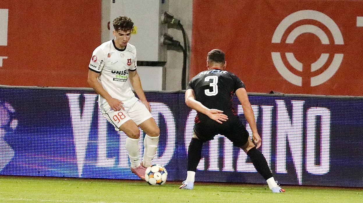 Kevin Andrei Ciubotaru si Raul Ioan Palmes in meciul de fotbal dintre AFC Hermannstadt Sibiu si FK Csikszereda Miercurea Ciuc, contand pentru Superliga Superbet, desfasurat pe Stadionul Municipal din Sibiu, luni 20 octombrie 2025. © FOTO:Valentin Macrea/SPORT PICTURES