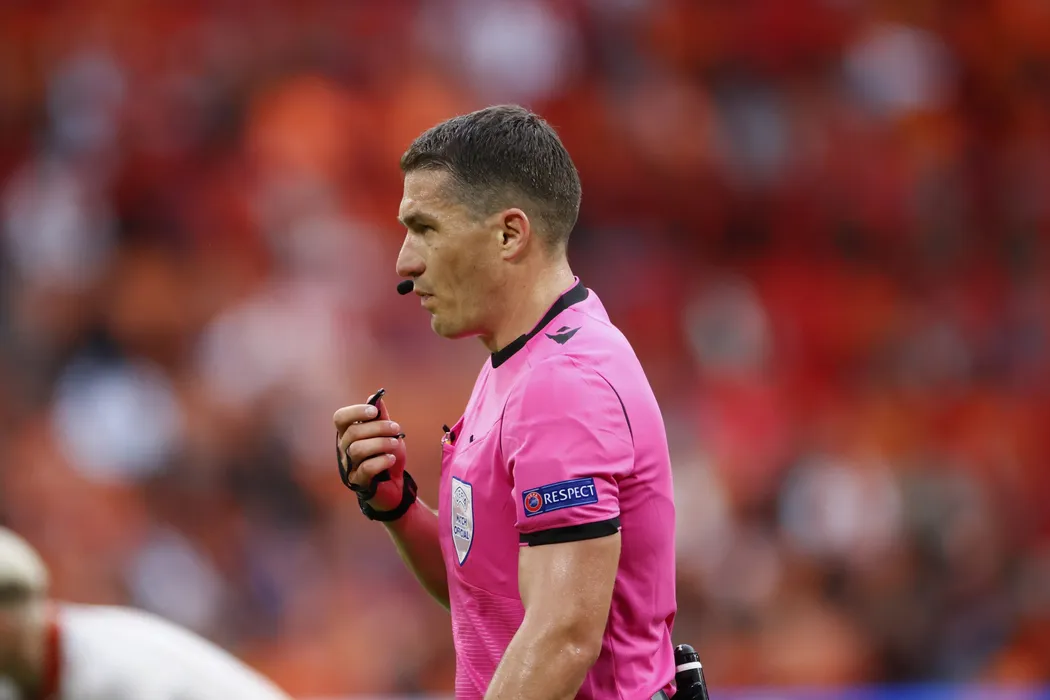 Romanian referee Istvan Kovacs during the Euro 2020 soccer championship group F match between North Macedonia and Netherlands, at the Johan Cruyff ArenA in Amsterdam, Netherlands, Monday, June 21 2021. (Koen van Weel/Pool via AP)