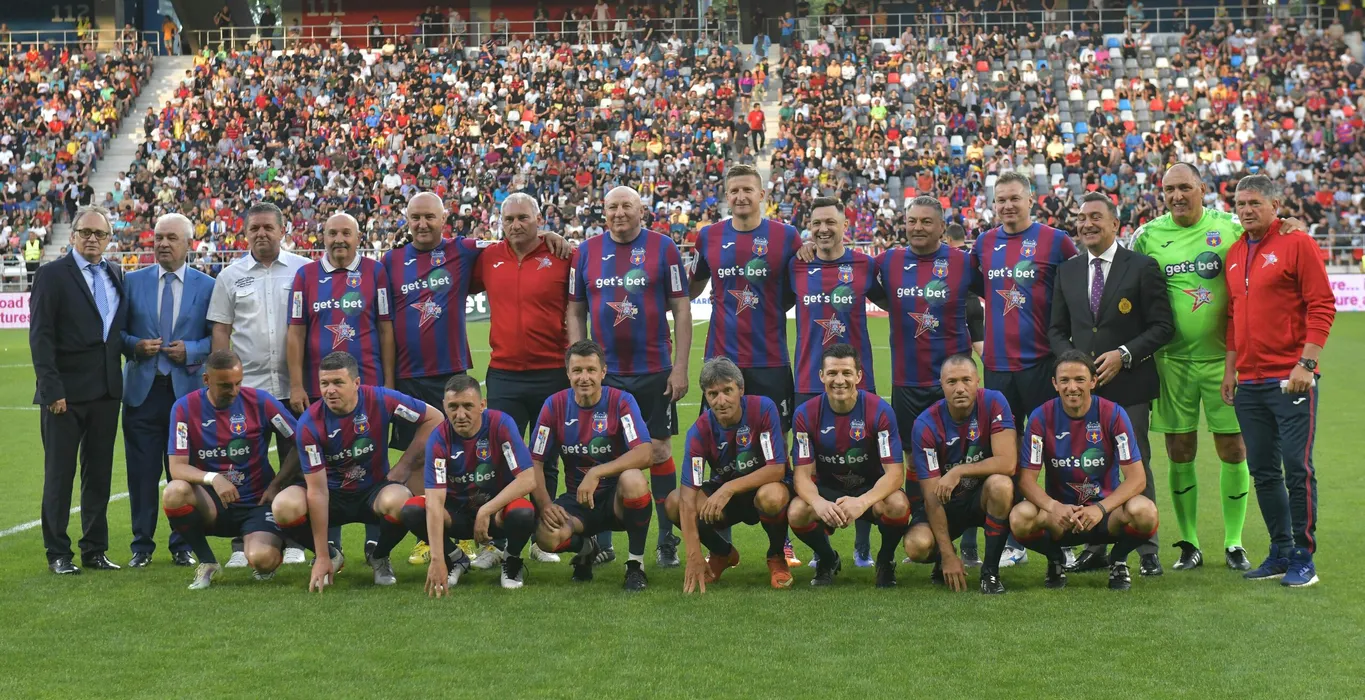Fotbalistii stelisti la o fotografie de grup realizata inaintea meciului de fotbal dintre Legende Steaua Bucuresti si Legende Romania desfasurat cu ocazia implinirii a 75 de ani de existenta a clubului militar, pe Stadionul Ghencea-Steaua din Bucuresti, marti 7 iunie 2022.