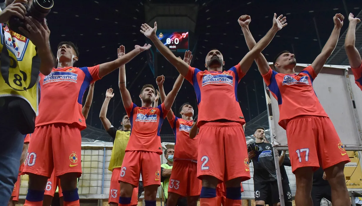 Fotbalistii stelisti AMarian Alexandru Musi, Denis Gratian Harut, Risto Radunovic, Valentin Cretu si Iulian Lucian Cristea saluta galeria dupa meciul de fotbal dintre FCSB si Dinamo Bucuresti, contand pentru Liga 1 Casa Pariurilor, desfasurat pe Arena Nationala din Bucuresti, duminica 12 septembrie 2021. Bucuresti *** AMarian Alexandrian Musi, Denis Gratian Harut, Risto Radunovic, Valentin Cretu and Iulian Lucian Cristea welcome the gallery after the football match between FCSB and Dinamo Bucharest, counting for Casa 1 Casa Pariurilor, held on the National Arena in Bucharest, Sunday, September 12, 2021 Bucharest Copyright: xRazvanxPasarica/SPORTxPICTURESx