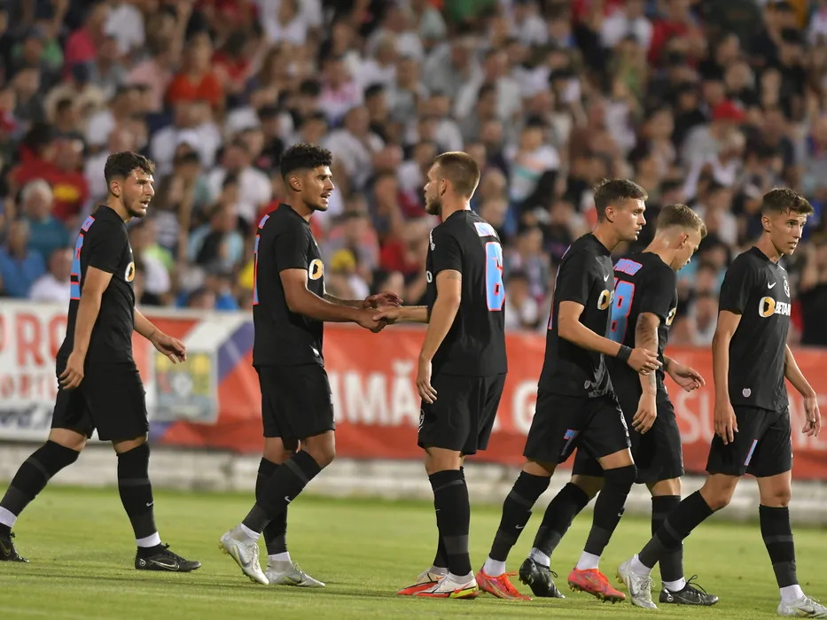 Bucurie a fotbalistilor stelisti dupa un gol marcat cu Ianis Ilie Stoica, Florinel Teodor Coman, Denis Gratian Harut, Sorin Danut Serban si Octavian George Popescu in meciul amical de fotbal dintre Otelul Galati si FCSB, desfasurat pe Stadionul Otelul din Galati, sambata 9 iulie 2022. © FOTO:Razvan Pasarica/SPORT PICTURES