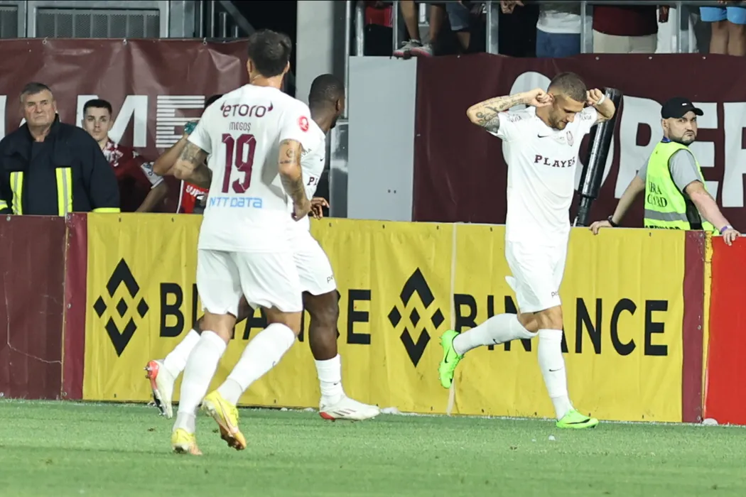 George Daniel Bîrligea se bucură după un gol marcat în meciul de fotbal dintre FC Rapid 1923 București și FC CFR 1907 Cluj, contând pentru Superliga Superbet, desfășurat pe Stadionul Superbet Arena - Giulești din București, sâmbătă 20 iulie 2024. © FOTO: Gică FLUȘTER/SPORT PICTURES