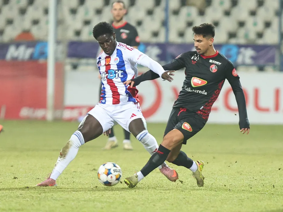 Fernandes Joao Paulo Moreira si Szilárd Veres in meciul de fotbal dintre SC Otelul Galati si FK Csikszereda Miercurea Ciuc, contand pentru Superliga Superbet, desfasurat pe Stadionul Otelul din Galati, luni 26 ianuarie 2026. © FOTO:Sorin Pana/SPORT PICTURES