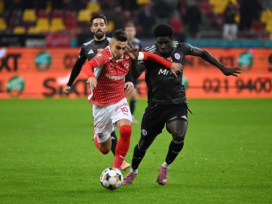 Catalin Ionut Cirjan si Fernandes Joao Paulo Moreira in meciul de fotbal dintre Dinamo Bucuresti si Otelul Galati, din cadrul Superligii Superbet, desfasurat pe Arena Nationala din Bucuresti, sambata 29 noiembrie 2025. © FOTO:Razvan Pasarica/SPORT PICTURES