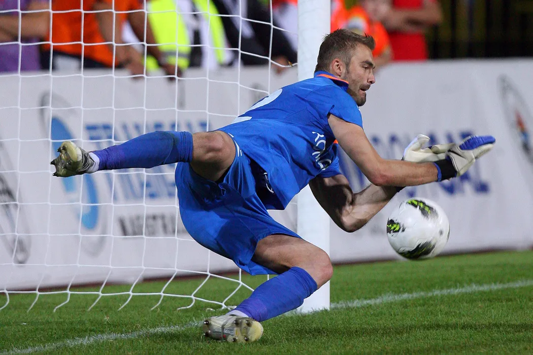 Razvan Plesca, portar la Gaz Metan Medias, apara o lovitura de la 11 metri, in timpul meciului cu FSV Mainz (Germania), din mansa secunda a turului trei preliminar al Ligii Europa, in Medias, joi, 4 august 2011. MIRCEA ROSCA / MEDIAFAX FOTO