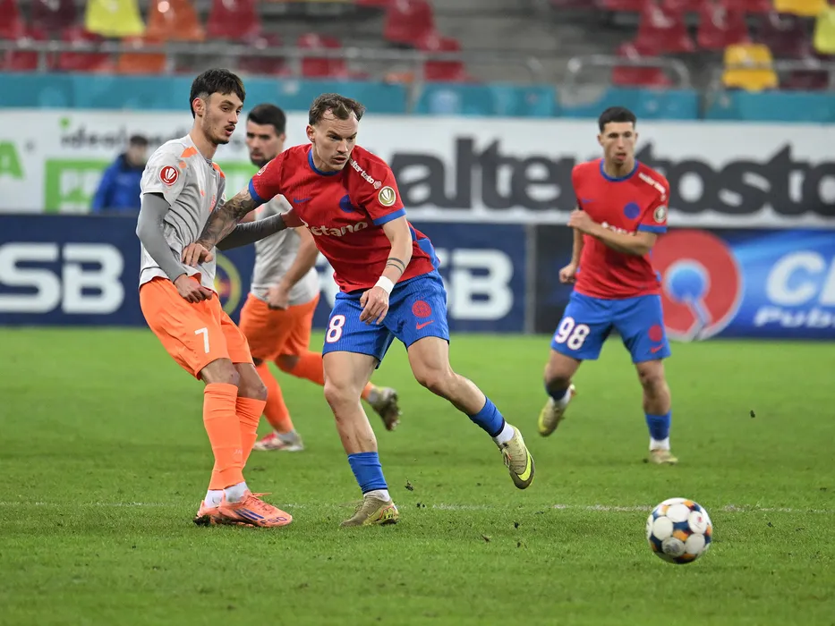 Laurentiu Marian Lis si Grigoraș Alexandru Pantea in meciul de fotbal dintre FCSB si Metaloglobus Bucuresti, contand pentru Superliga Superbet, desfasurat pe Arena Nationala din Bucuresti, luni 23 februarie 2026. © FOTO:Razvan Pasarica/SPORT PICTURES