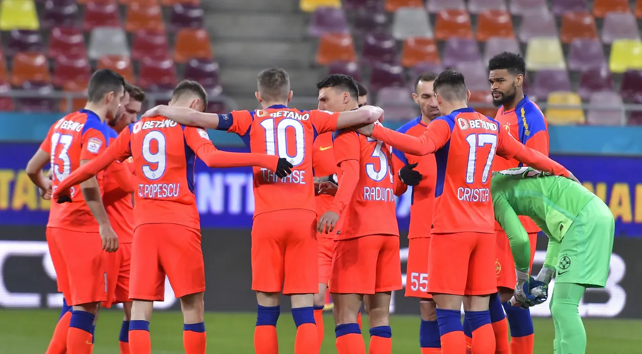 Fotbalistii stelisti printre care Risto Radunovic si Sylas Laouari Edjouma Malcom se incurajeaza la startul meciului de fotbal dintre FCSB si Chindia Targoviste, contand pentru Liga 1 Casa Pariurilor, desfasurat pe Arena Nationala din Bucuresti, duminica 13 februarie 2022. © FOTO:Razvan Pasarica/SPORT PICTURES