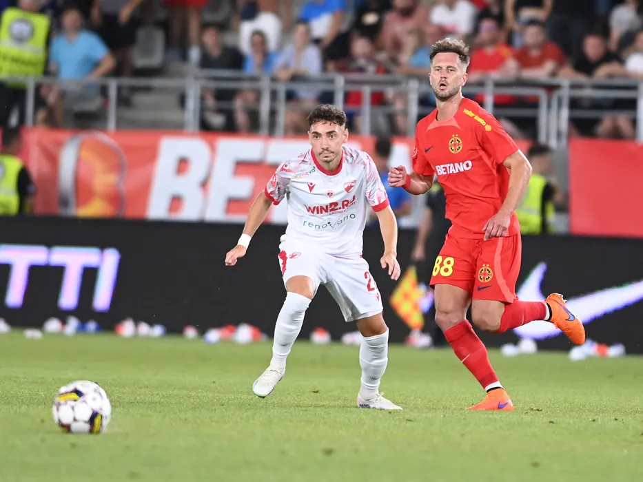 Andrei Ahmed Mustafa Bani si Damjan Djokovic in meciul de fotbal dintre FCSB si Dinamo Bucuresti, din cadrul Superligii Superbet, desfasurat pe Stadionul National Arcul de Triumf din Bucuresti, sambata 22 iulie 2023. © FOTO:Razvan Pasarica/SPORT PICTURES