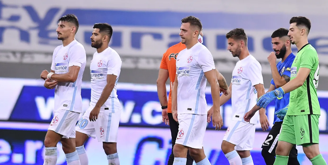 Fotbalistii stelisti Iulian Lucian Cristea, Ionut Daniel Vina, Andrei George Miron, Robert Andrei Ion si Andrei Daniel Vlad parasesc bucurosi terenul dupa meciul de fotbal dintre FCSB si FC Viitorul Constanta, contand pentru Liga 1 Casa Pariurilor, desfasurat fara spectatori pe Arena Nationala din Bucuresti, duminica 30 august 2020. © FOTO:Razvan Pasarica/SPORT PICTURES
