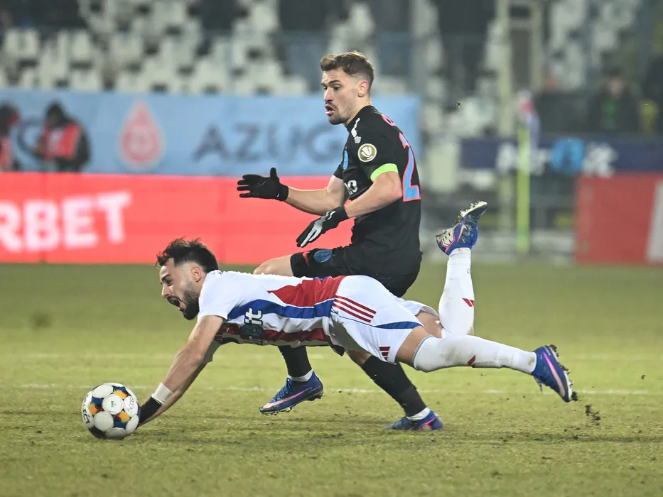 Virgil Andrei Ciobanu si Darius Dumitru Olaru in meciul dintre Otelul Galati si FCSB, contand pentru Superliga Superbet, desfasurat pe Stadionul Otelul din Galati, duminica 8 februarie 2026. © FOTO:Razvan Pasarica/SPORT PICTURES