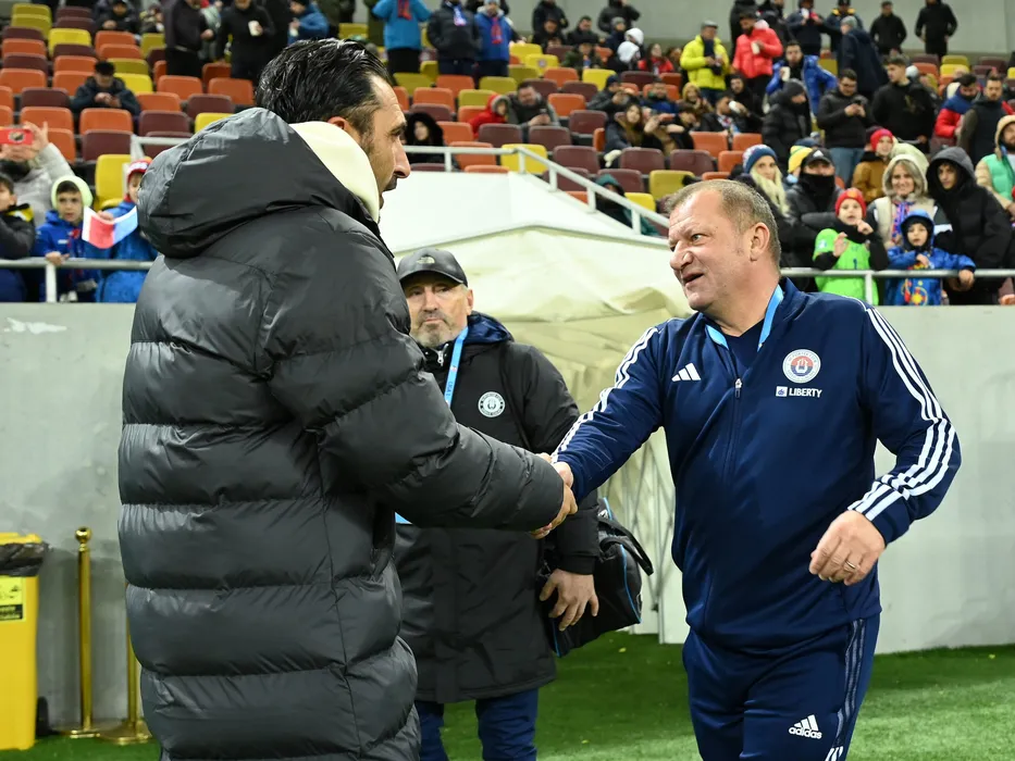 Cei doi antrenori Elias Charalambous si Dorinel Ionel Munteanu se saluta inaintea meciului de fotbal dintre FCSB si Otelul Galati, din cadrul Superligii Superbet, desfasurat pe Arena Nationala din Bucuresti, duminica 3 decembrie 2023. © FOTO:Razvan Pasarica/SPORT PICTURES