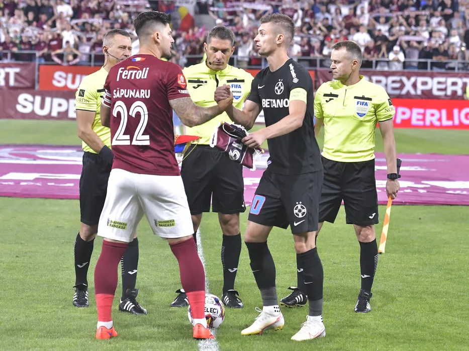 Brigada de arbitrii formata din Vasile Marinescu, Istvan Kovacs si Ovidiu Artene alaturi de capitanii Cristian Ionut Sapunaru si Florin Lucian Tanase in meciul de fotbal dintre Rapid Bucuresti si FCSB, contand pentru Superliga Superbet, desfasurat pe Stadionul Rapid Giulesti din Bucuresti, duminica 24 iulie 2022. © FOTO:Razvan Pasarica/SPORT PICTURES