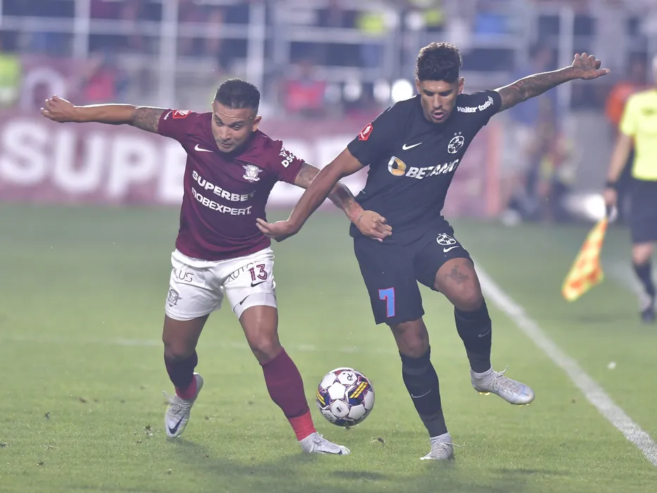 Morais Junior Iraneuton Sousa si Florinel Teodor Coman in meciul de fotbal dintre Rapid Bucuresti si FCSB, contand pentru Superliga Superbet, desfasurat pe Stadionul Rapid Giulesti din Bucuresti, duminica 24 iulie 2022. © FOTO:Razvan Pasarica/SPORT PICTURES