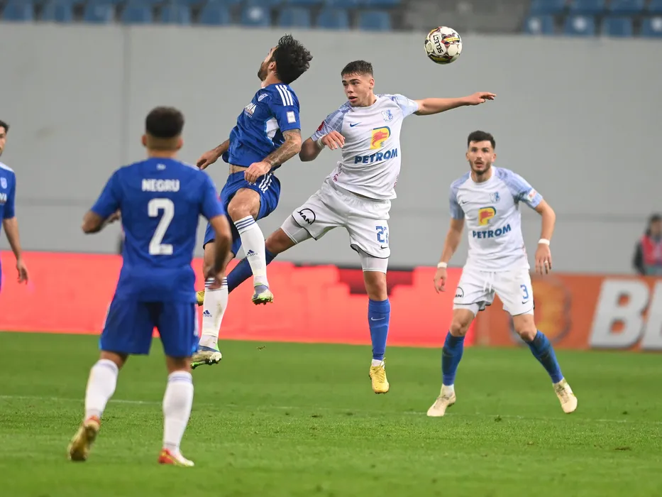 Aurelian Ionut Chitu si Sebastian Andrei Borza in meciul de fotbal dintre FC U Craiova si Farul Constanta, contand pentru Superliga Superbet, desfasurat pe Stadionul Ion Oblemenco din Craiova, vineri 28 octombrie 2022. © FOTO:Razvan Pasarica/SPORT PICTURES
