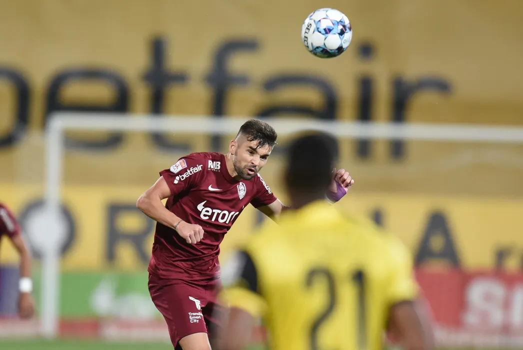 Mateo Susic (S), de la CFR Cluj, lupta pentru balon in timpul meciului de fotbal contra echipei Young Boys din turul 3 preliminar al Ligii Campionilor, disputat pe stadionul Dr. Constantin Radulescu, marti, 3 august 2021. DAN HORIA TAUTAN / MEDIAFAX FOTO