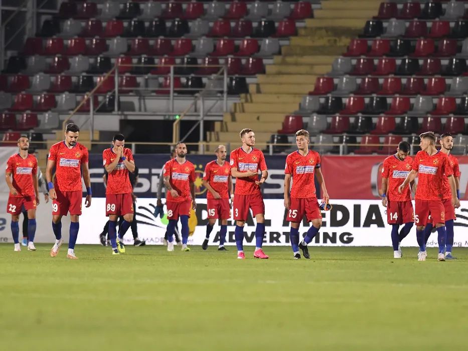Fotbalistii stelisti Adrian Tabarcea Petre, Adrian Sut, Ionut Constantin Pantiru, Ovidiu Ioan Perianu, Gabriel Enache si David Caiado intra pe teren la meciul de fotbal dintre FCSB si Slovan Liberec, contand pentru Liga Europa, desfasurat fara spectatori pe Stadionul Marin Anastasovici din Giurgiu, miercuri 24 septembrie 2020. © FOTO:Razvan Pasarica/SPORT PICTURES