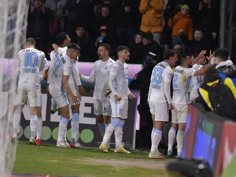 Bucurie a fotbalistilor stelisti dupa un gol marcat cu Sylas Laouari Edjouma Malcom, Iulian Lucian Cristea, Iulian Lucian Cristea, Ianis Ilie Stoica, Risto Radunovic si Valentin Cretu in meciul de fotbal dintre CFR Cluj si FCSB, contand pentru Play-off-ul Ligii 1 Casa Pariurilor, desfasurat pe Stadionul CFR Dr. Constantin Radulescu din Cluj Napoca, duminica 17 aprilie 2022. © FOTO:Razvan Pasarica/SPORT PICTURES