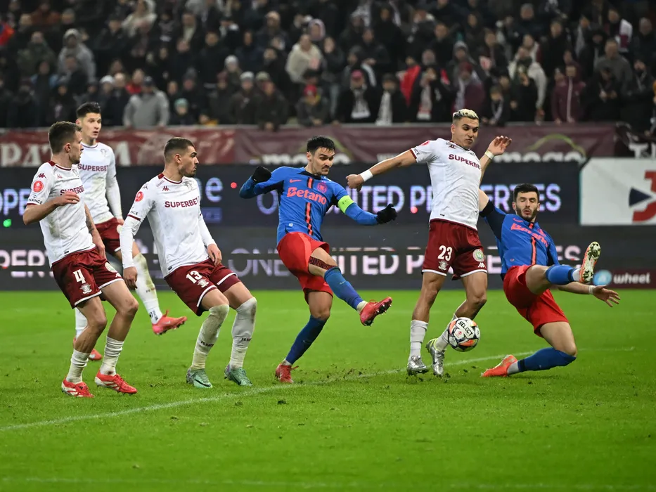 Mattias Kait, Denis Ciobotariu, Adrian Gheorghe Sut, Cristian Marian Manea si Mihai Popescu in meciul de fotbal dintre Rapid Bucuresti si FCSB, din cadrul Superligii Superbet, desfasurat pe Arena Nationala din Bucuresti, duminica 2 martie 2025. © FOTO:Razvan Pasarica/SPORT PICTURES