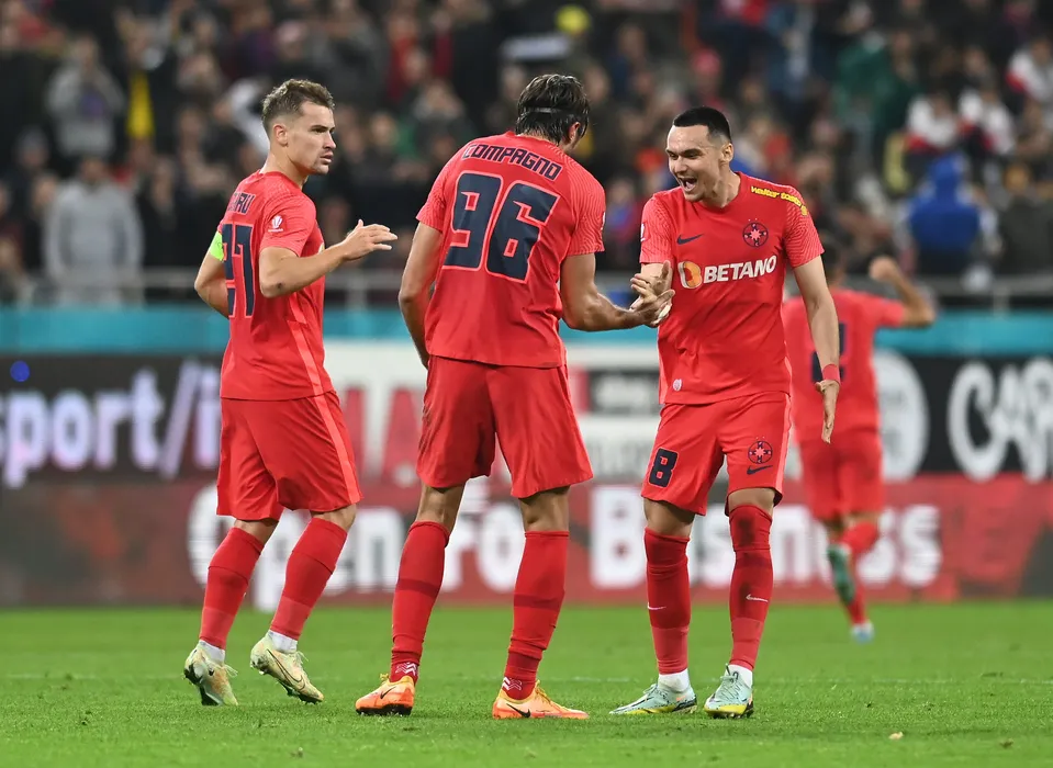 Bucurie a fotbalistilor stelisti dupa un gol marcat cu Darius Dumitru Olaru, Andrea Compagno si Adrian Gheorghe Sut in meciul de fotbal dintre FCSB si Rapid Bucuresti, contand pentru Superliga Superbet, desfasurat pe Arena Nationala din Bucuresti, duminica 6 noiembrie 2022. © FOTO:Razvan Pasarica/SPORT PICTURES