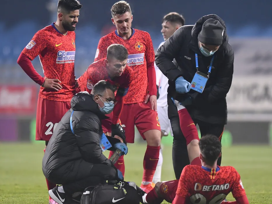 Dennis Man accidentat in preajma doctorilor si colegilor sai Ionut Daniel Vina, Florin Lucian Tanase si Ovidiu Ioan Perianu in meciul de fotbal dintre Gaz Metan Medias si FCSB, contand pentru Liga 1 Casa Pariurilor, desfasurat fara spectatori pe Stadionul Municipal din Medias, luni 23 noiembrie 2020. © FOTO:Razvan Pasarica/SPORT PICTURES