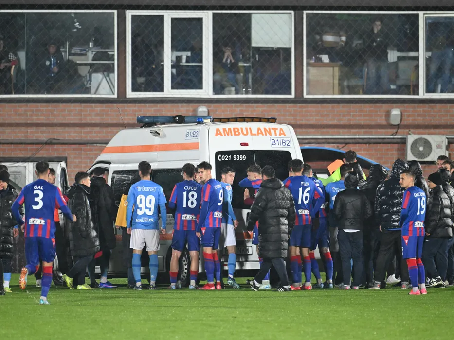 Jucatorii printre care Schieb Marvin, Andreas Catalin Chiritoiu, Rares Enceanu pe langa ambulanta ce il transporta pe Daniel Alexandru Git la meciul de fotbal dintre FC Voluntari si FC Bihor Oradea, contand pentru Play off-ul Ligii a-2-a Casa Pariurilor, desfasurat pe Stadionul Anghel Iordanescu din Voluntari, joi 30 aprilie 2026. © FOTO:Razvan Pasarica/SPORT PICTURES