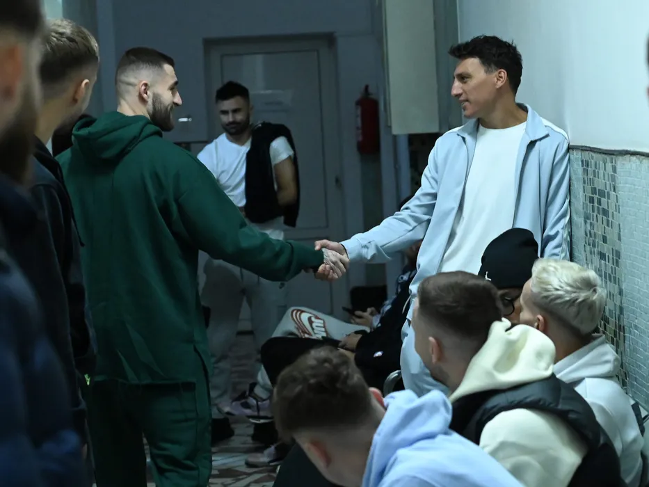 Ovidiu Marian Popescu il saluta pe Risto Radunovic la vizita medicala efectuata de fotbalistii de la FCSB la Institutul National de Medicina Sportiva din Bucuresti, luni 8 ianuarie 2024. © FOTO:Razvan Pasarica/SPORT PICTURES